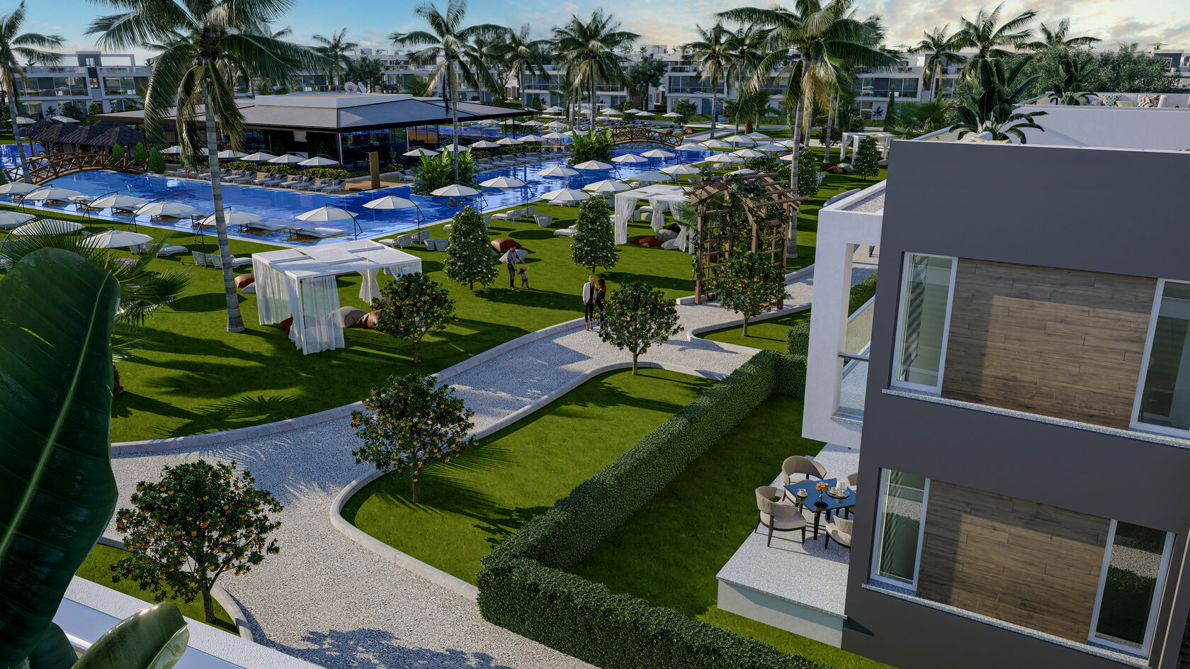 A luxurious 1+1 apartment on the ground floor is offered for sale in the new elite complex Four Seasons Life III, located in the Boaz (Iskele) area. The main advantage of this offer is walking distance to a private sandy beach and a unique combination of modern minimalist design with natural harmony.