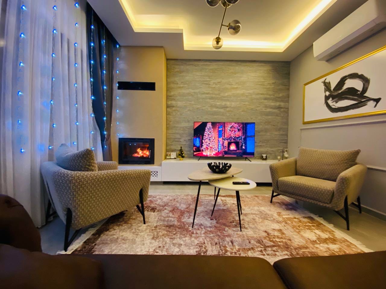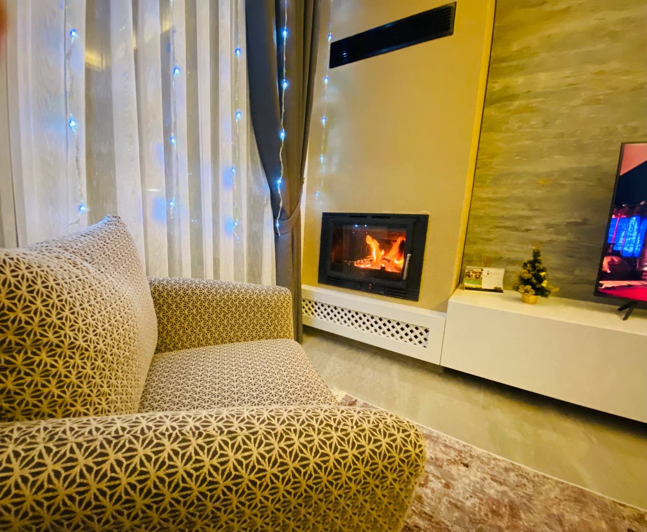 On the 1st floor: Living room with a cozy fireplace, separate kitchen, bathroom, and two terraces for relaxation.