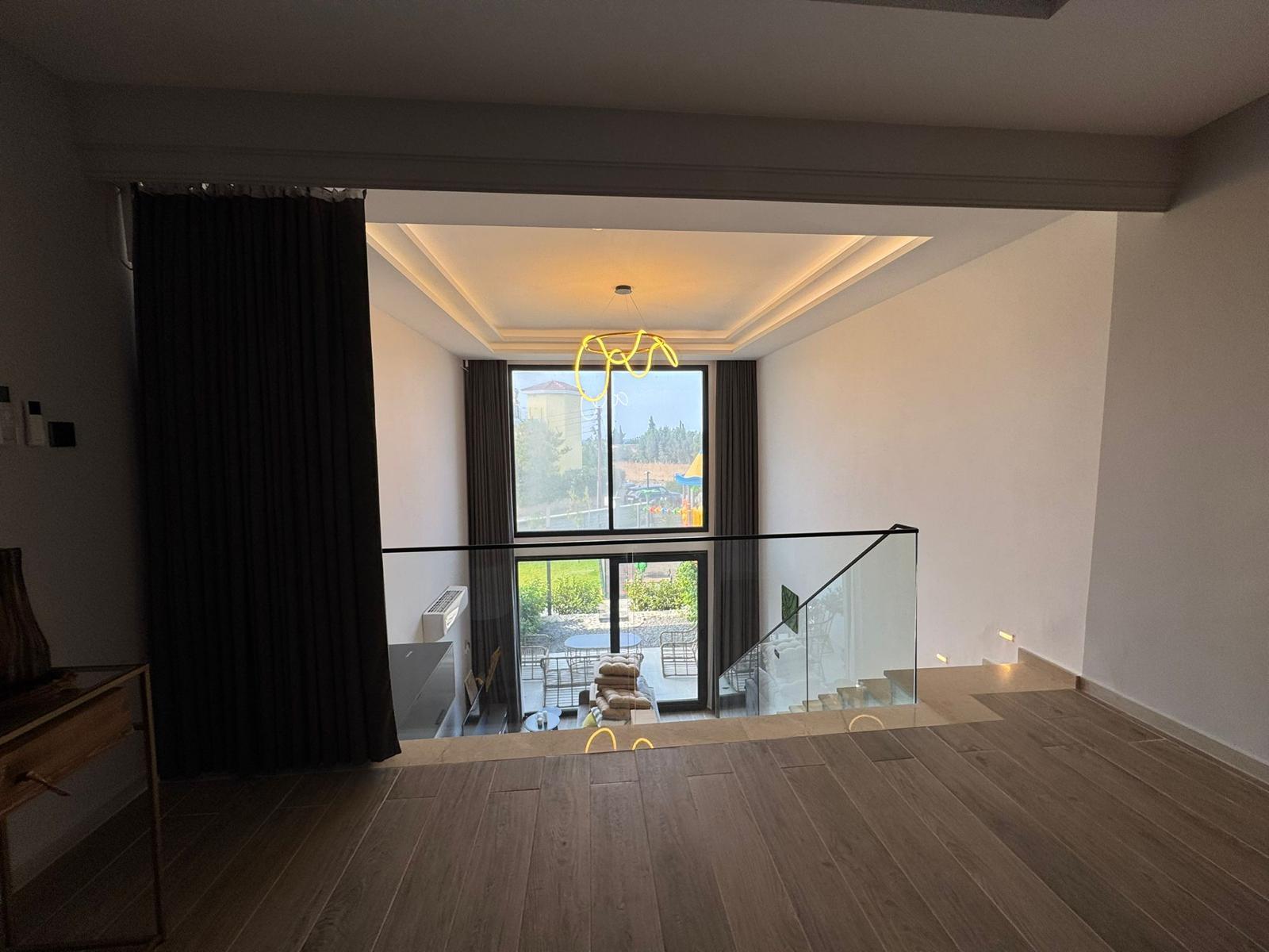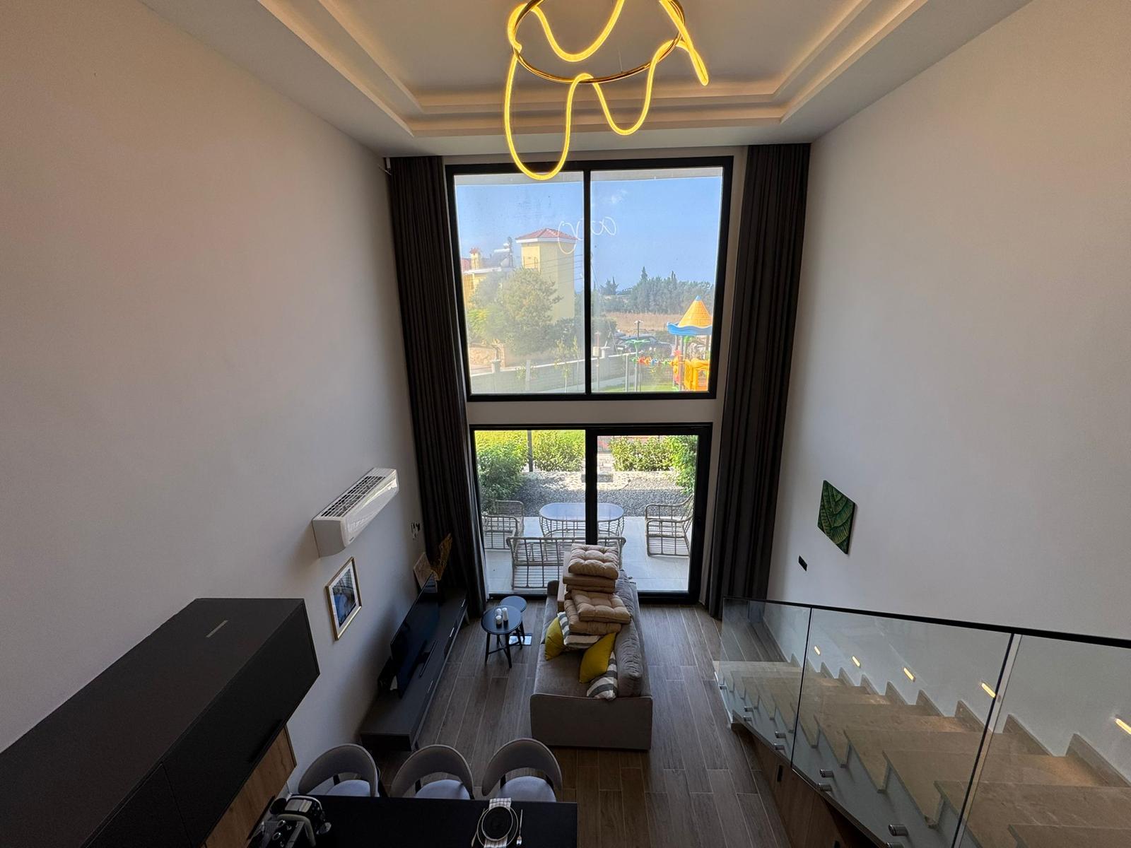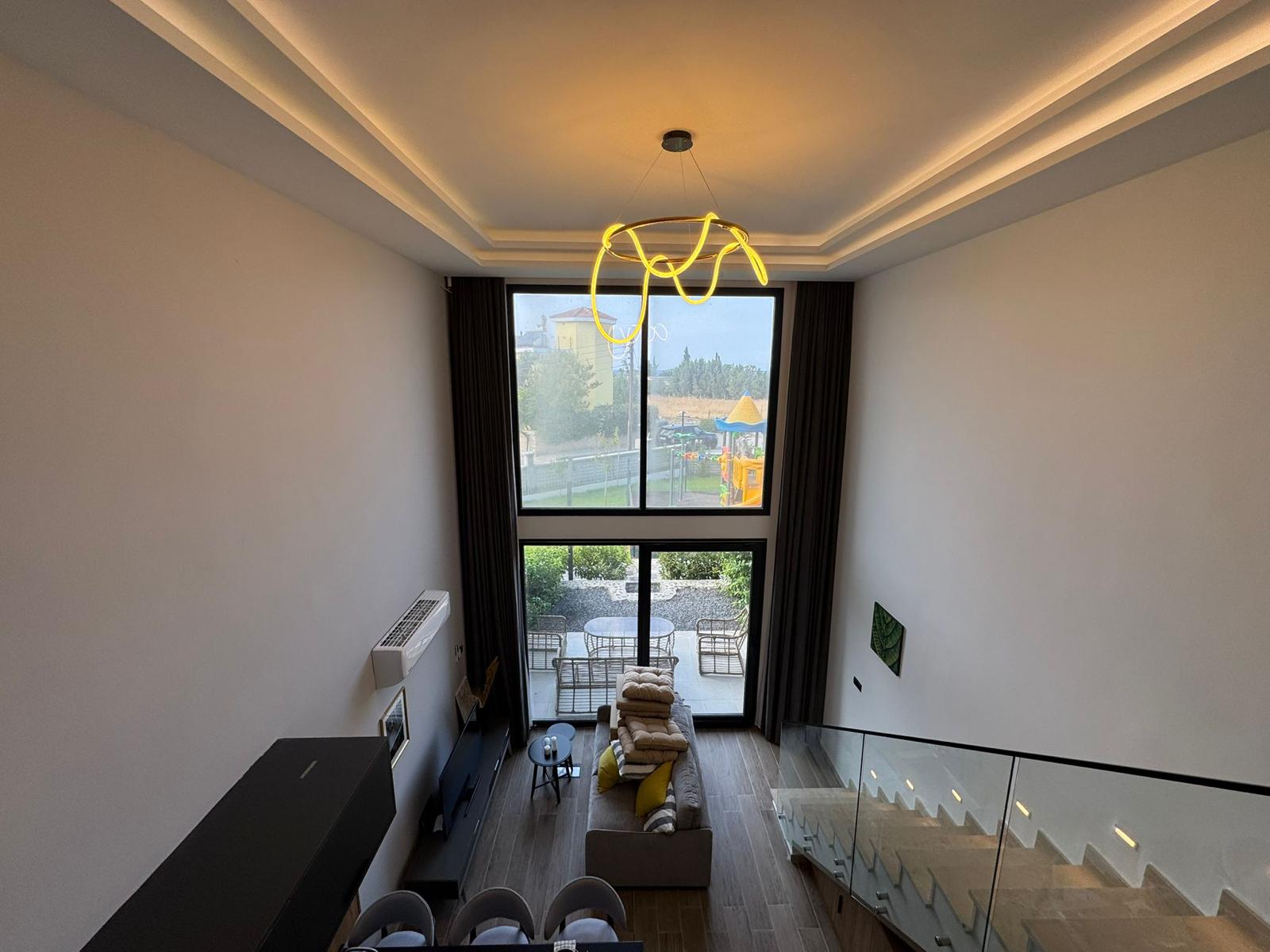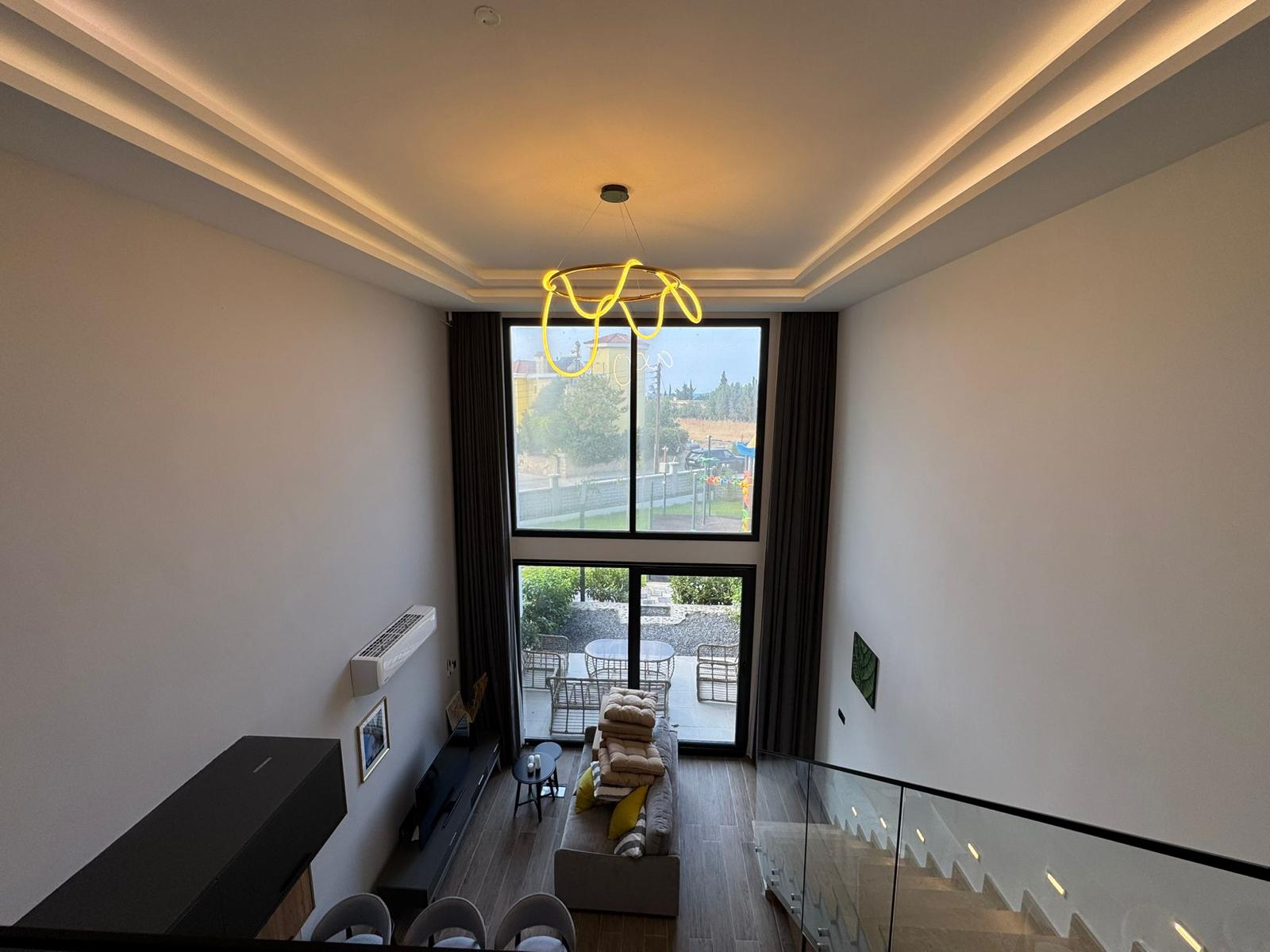A spacious two-level 2+1 loft is offered for sale in the Olivia Court residential complex, located just 350 meters from the sea, in one of the most picturesque corners of Lapta. The peaceful atmosphere and proximity to the mountains and the sea coast make this property ideal for living and relaxing.