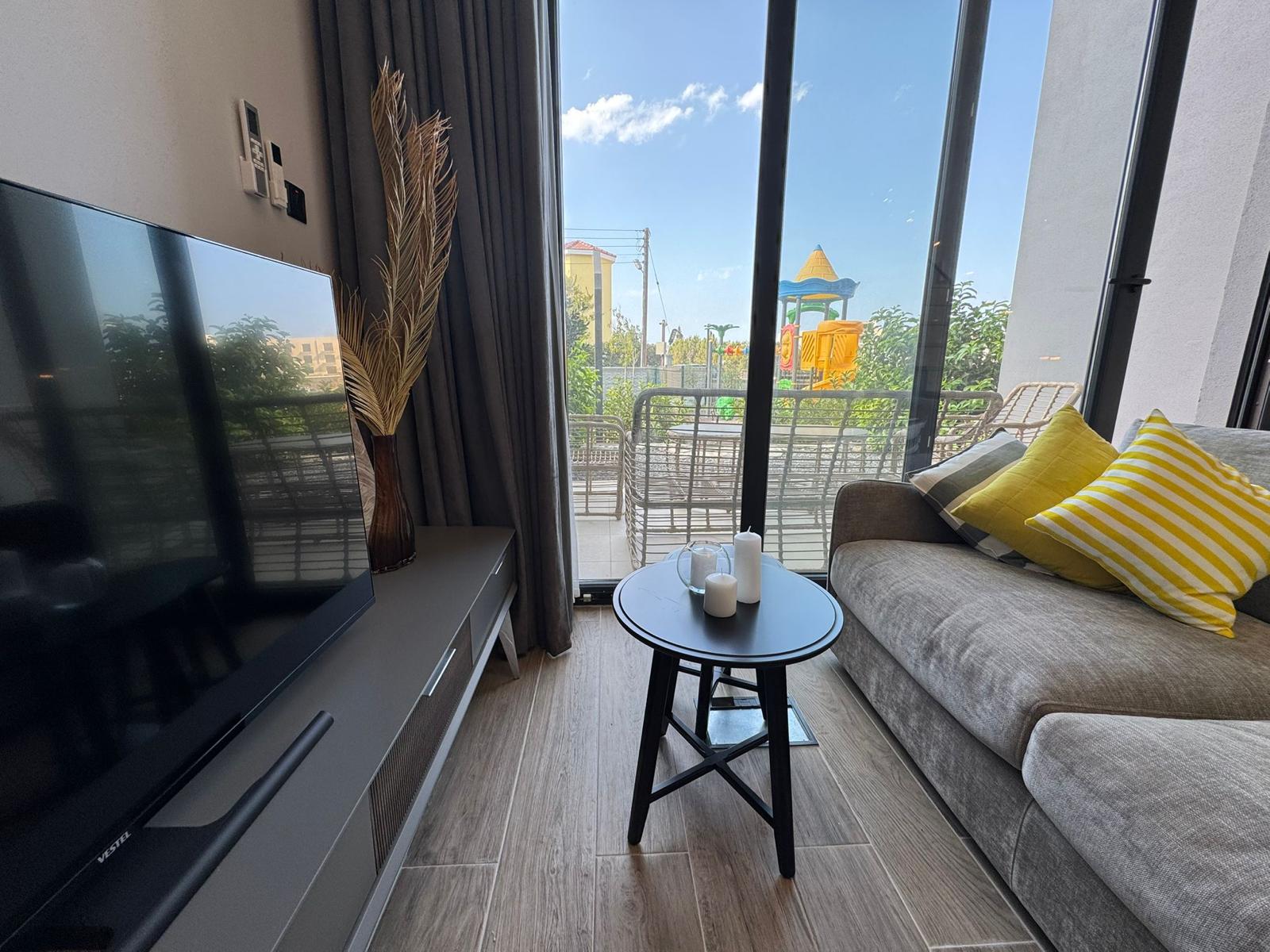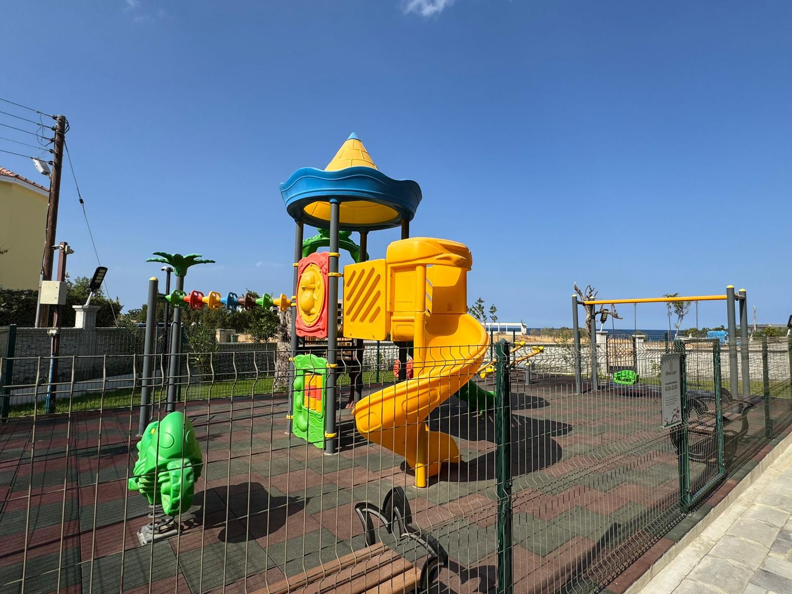 The complex includes a large 30×14 m swimming pool, a fitness room, a playground, a café, and a shared terrace. Shops and public transport stops are within walking distance, and a hotel and casino are being built nearby, which increases the investment appeal of the property.